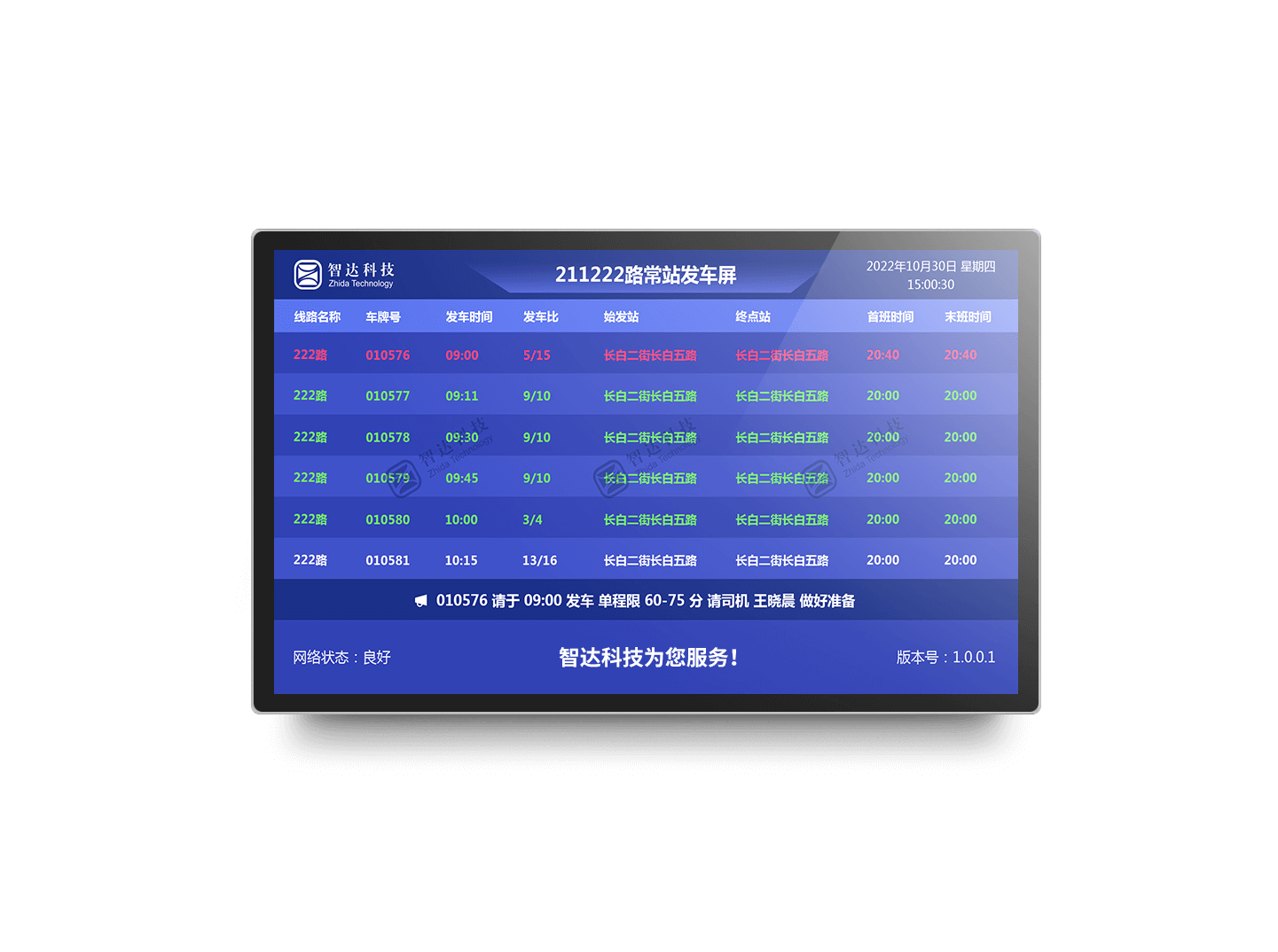 司乘信息发布屏设置在备班室、食堂等区域,用于向司机、乘务员发布排班计划,催发信息,通知信息等。